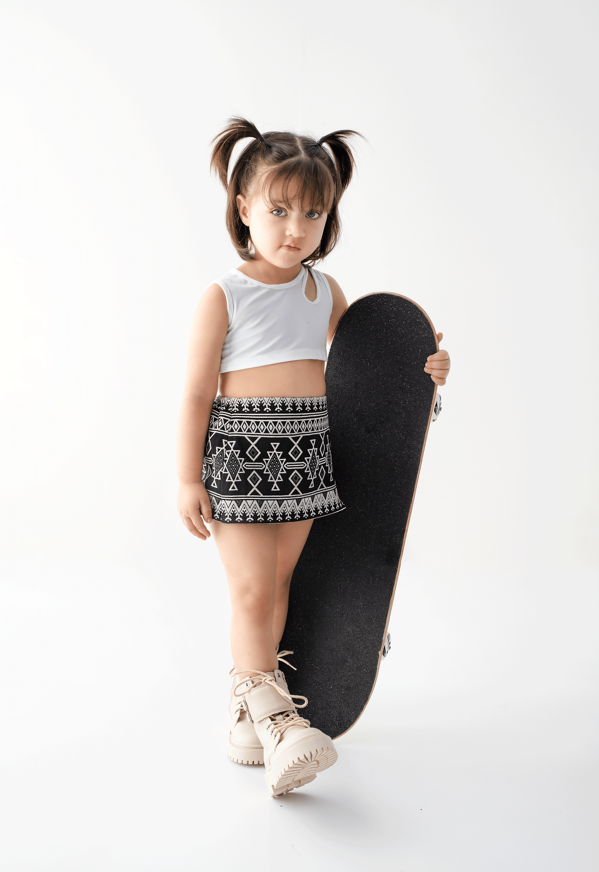 Add a playful touch to your child's wardrobe with the Betty Skirt, crafted from premium jacquard fabric featuring eye-catching geometric prints. The unique pattern adds a fun and modern twist to any outfit, making it the perfect piece for both casual and dressier occasions. Pair it with a sleek white and black crop top to complete the look and elevate your little one’s style. A must-have for every fashion-forward kid.