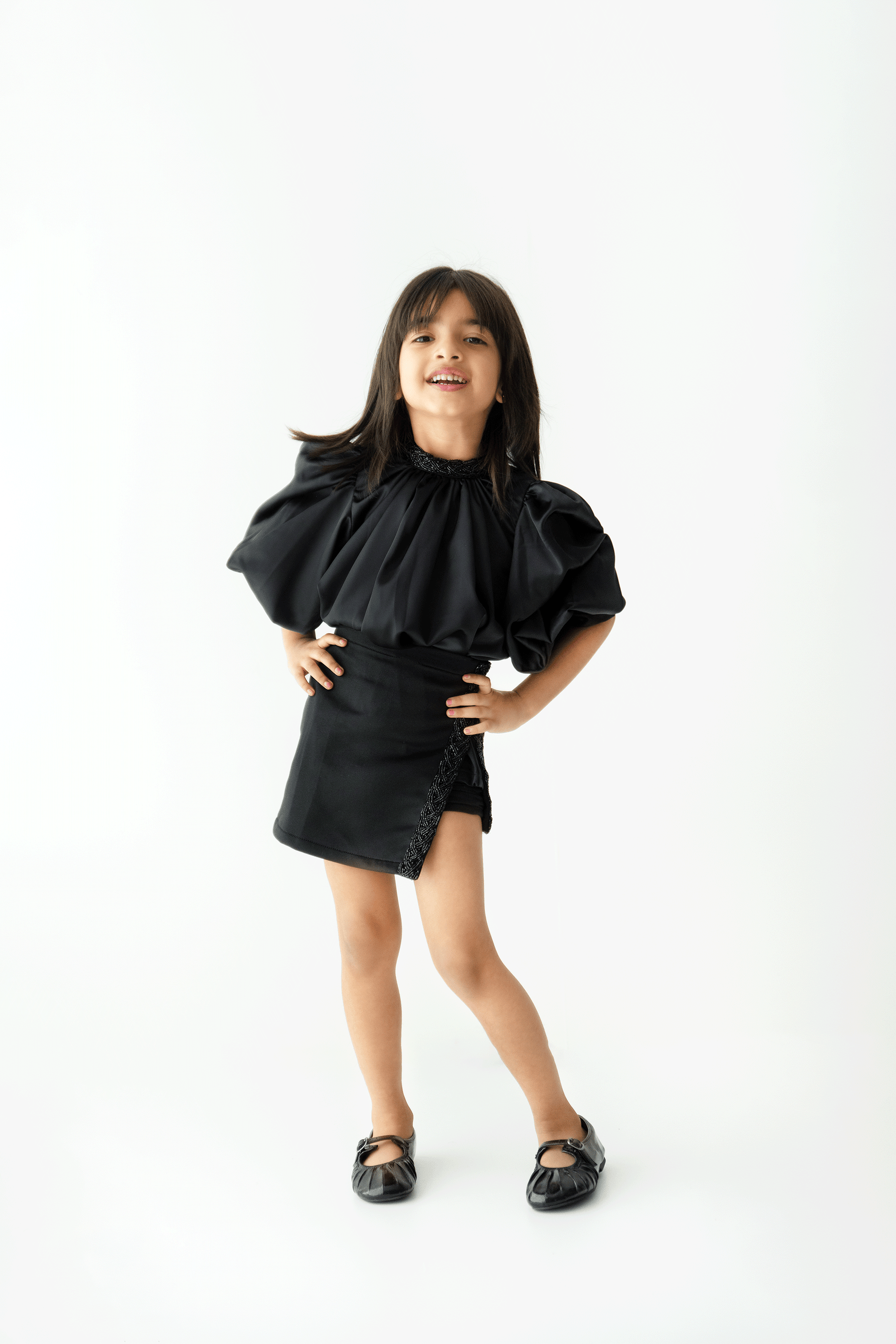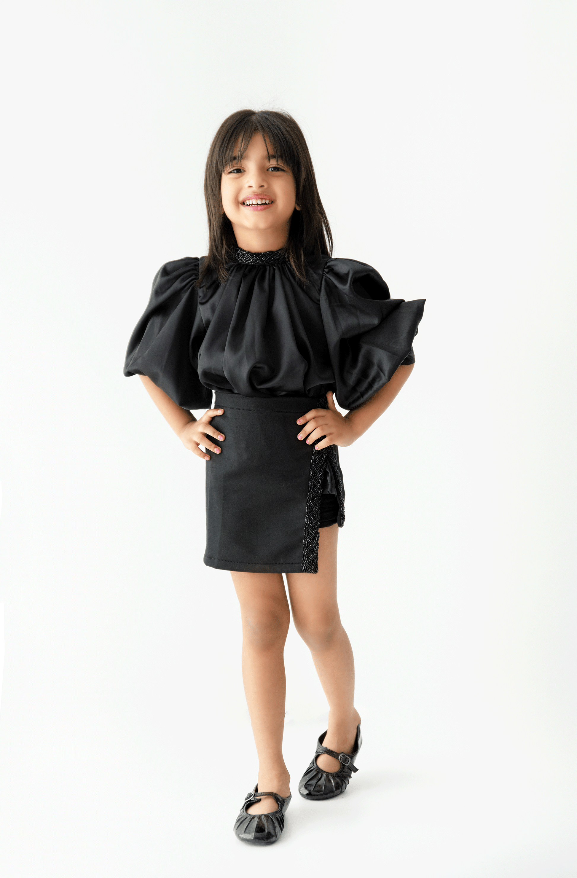 Meet our Bella Coord Set – a blend of elegance and charm crafted from luxurious satin. With its lustrous sheen, soft feel, and versatile design, it is Paired with bead embroidered side slit skirt. The mix of luxury satin and scuba fabric feel both stylish and comfortable for the kids. The bead embroidery is a nice touch, giving it festive, elevated feel.