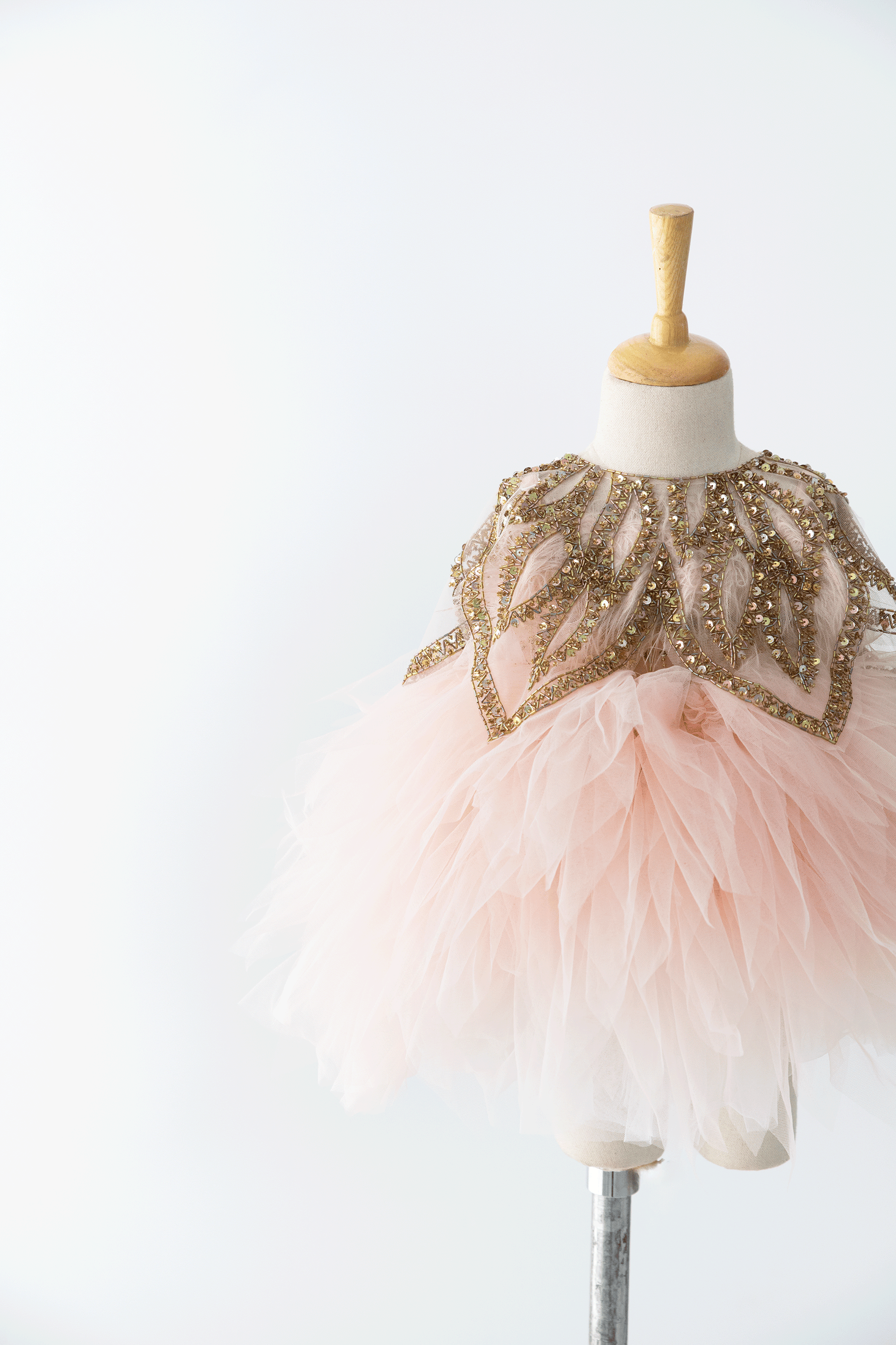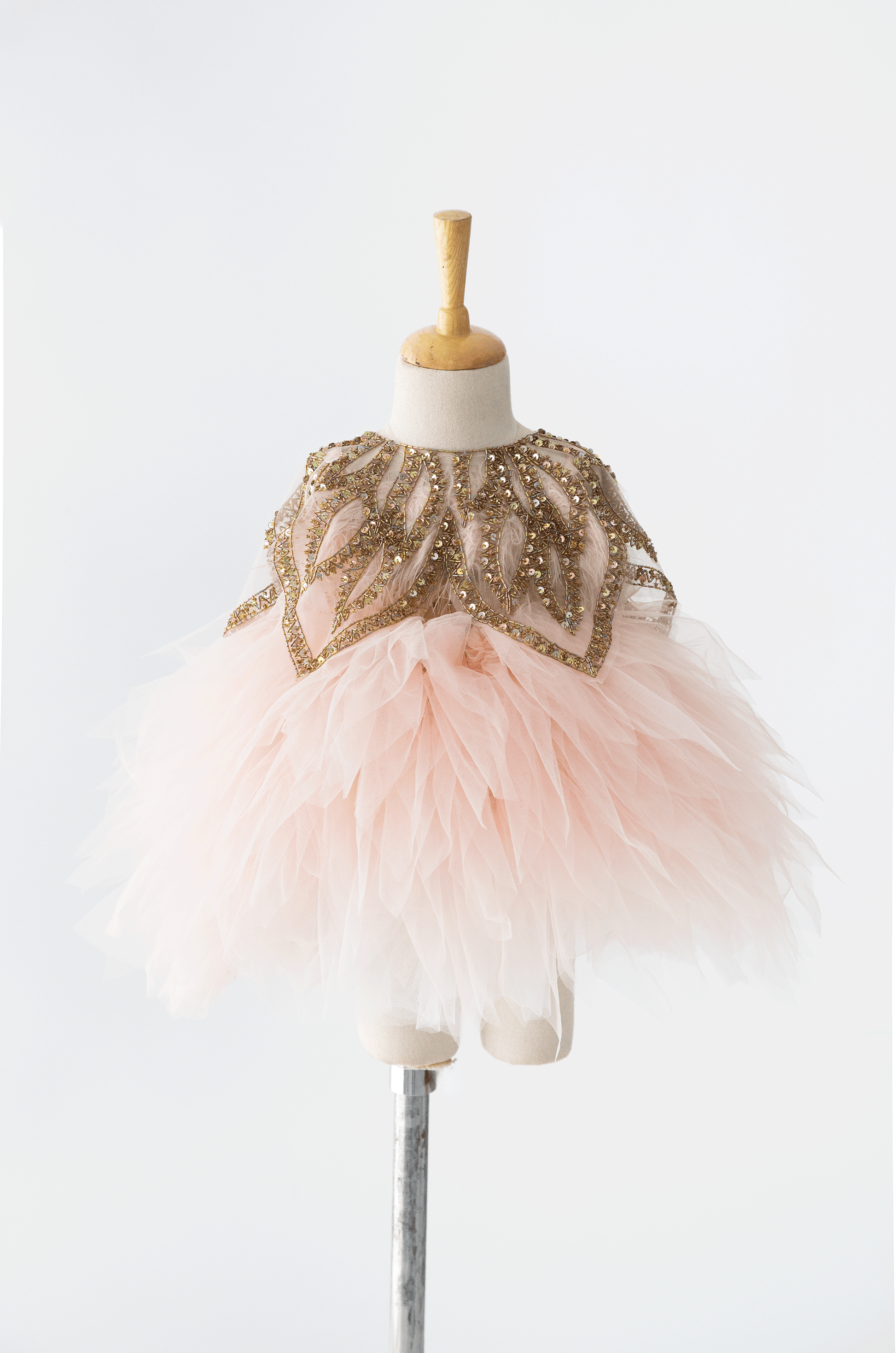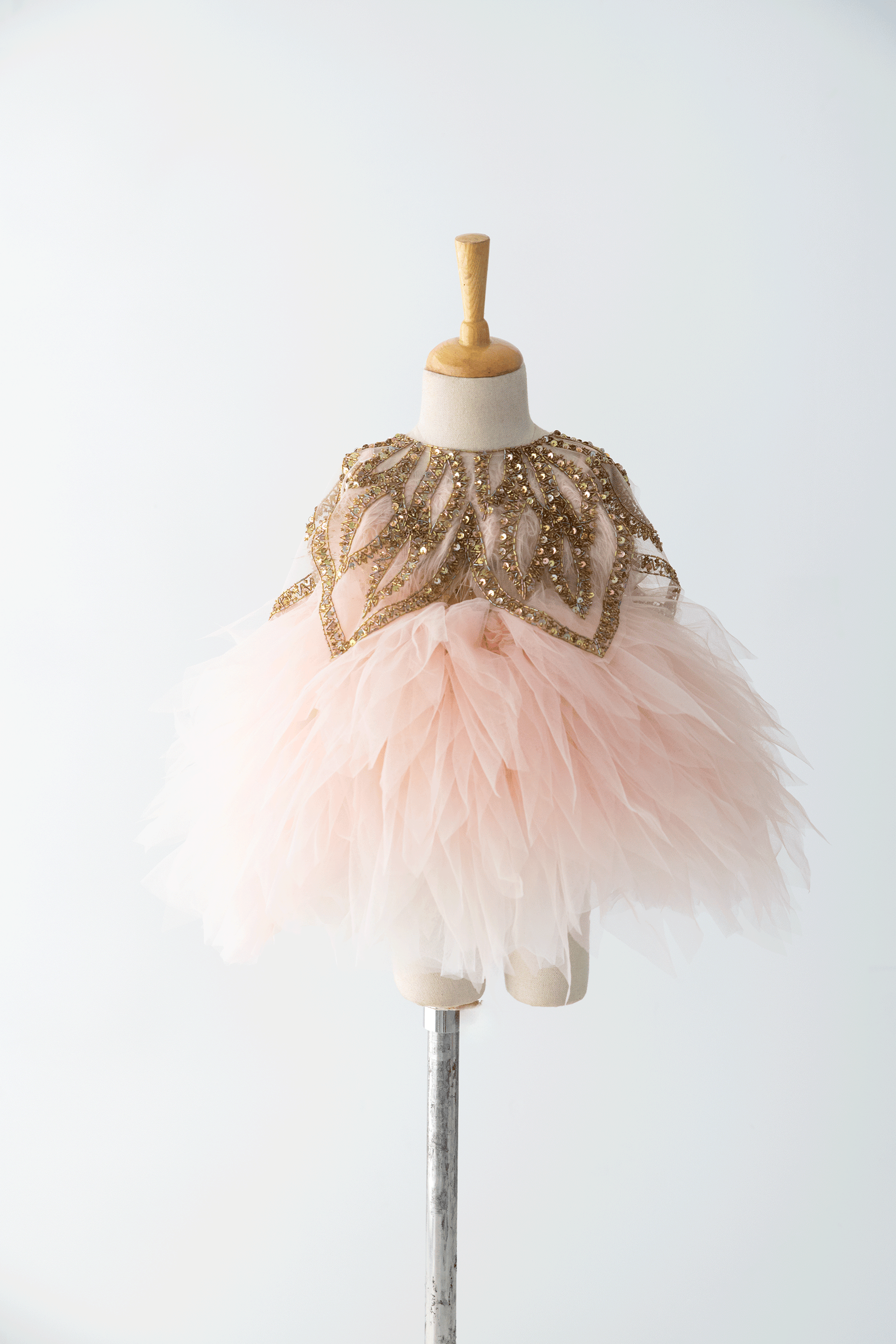 The Lucy Dress - The feather and sequin hand embroidery adds a luxurious and glamorous touch, making the dress truly extraordinary. The beautifully patterned bottom enhances its elegance, creating a unique and eye-catching design. The embroidered cape is the perfect finishing detail, completing the overall look and adding a dramatic flair. This dress would undoubtedly make your daughter feel like a star at any special occasion she attends, combining beauty, grace, and a touch of magic all in one.